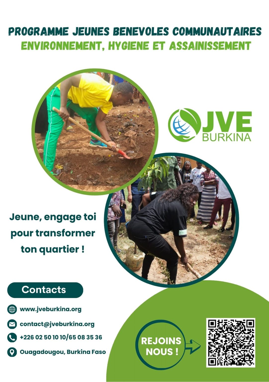 Le Programme Jeunes Bénévoles Communautaires Environnement Hygiène et Assainissement (PJBCEHA) est une initiative de l’Association Jeunes Volontaires pour l’Environnement. D’une durée de 3 ans, le programme couvre la période d’octobre 2025 à septembre 2028. De façon spécifique, il vise d’une part à organiser les jeunes filles et garçons du Burkina Faso afin de leur permettre de porter le leadership d’une gestion communautaire des problèmes environnementaux dont l’hygiène publique, le péril plastique, l’atténuation des changements climatiques, et d’autre part à soutenir la création d’entreprises dans le secteur des emplois verts pour offrir des opportunités professionnelles aux jeunes, aux femmes et aux personnes vulnérables.